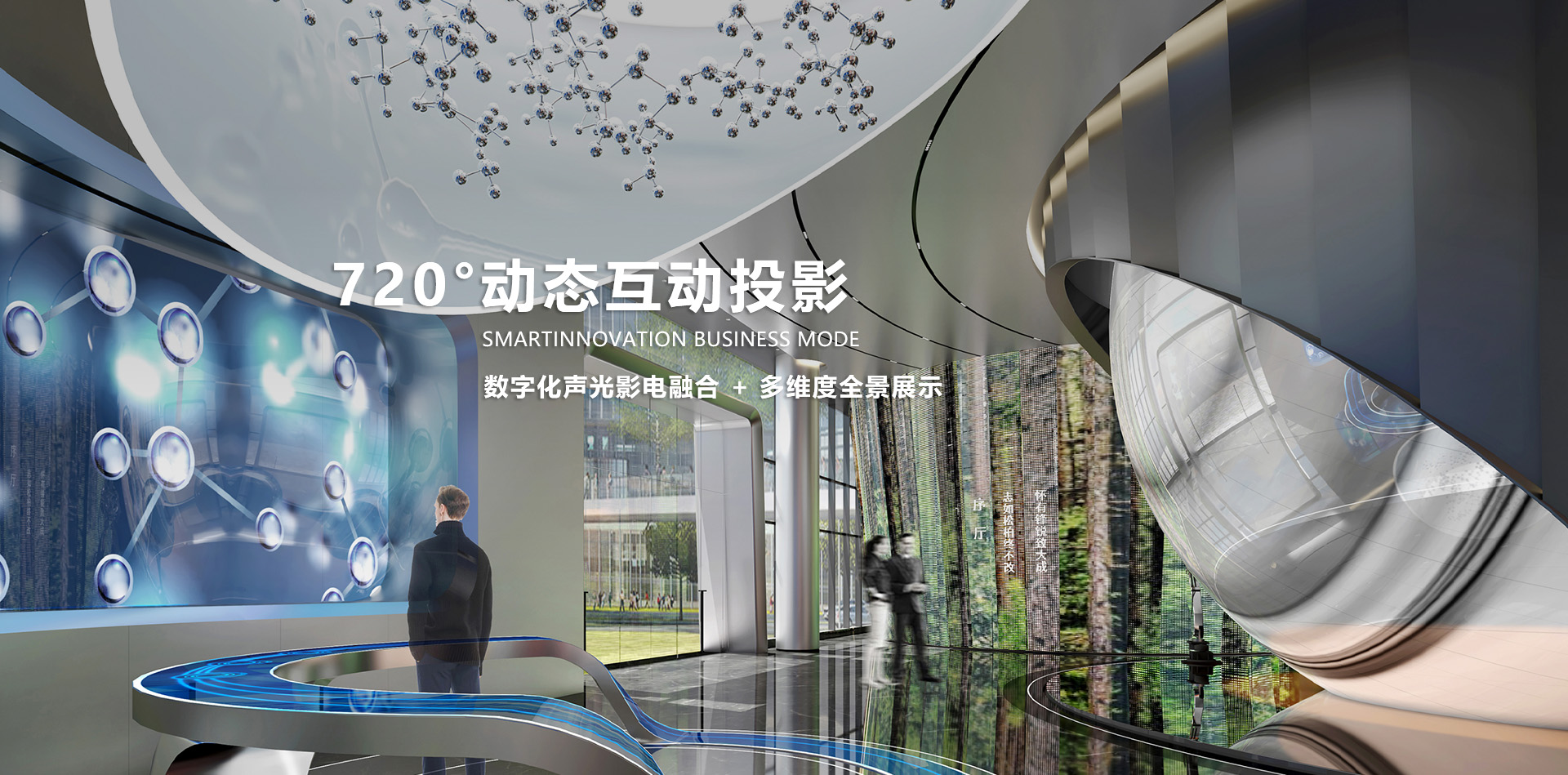 數(shù)字信息時代,華竣數(shù)創(chuàng)運(yùn)用燈光秀、超清視頻、特種影院等新媒體視覺藝術(shù)的聲光影電炫酷效果調(diào)動觀者的所有感官全身心參與展廳視聽體驗(yàn),享受沉浸式心流狀態(tài)。
